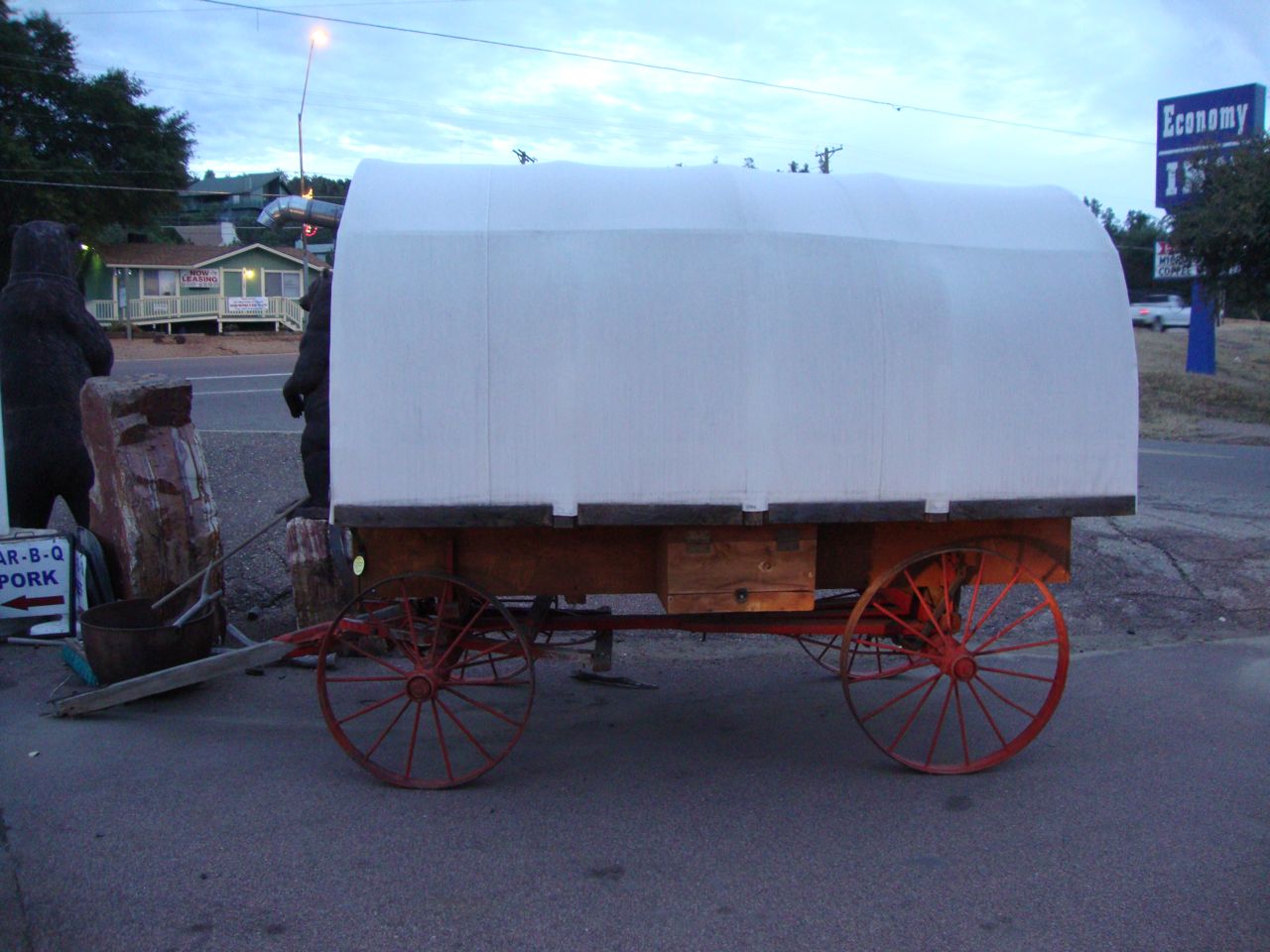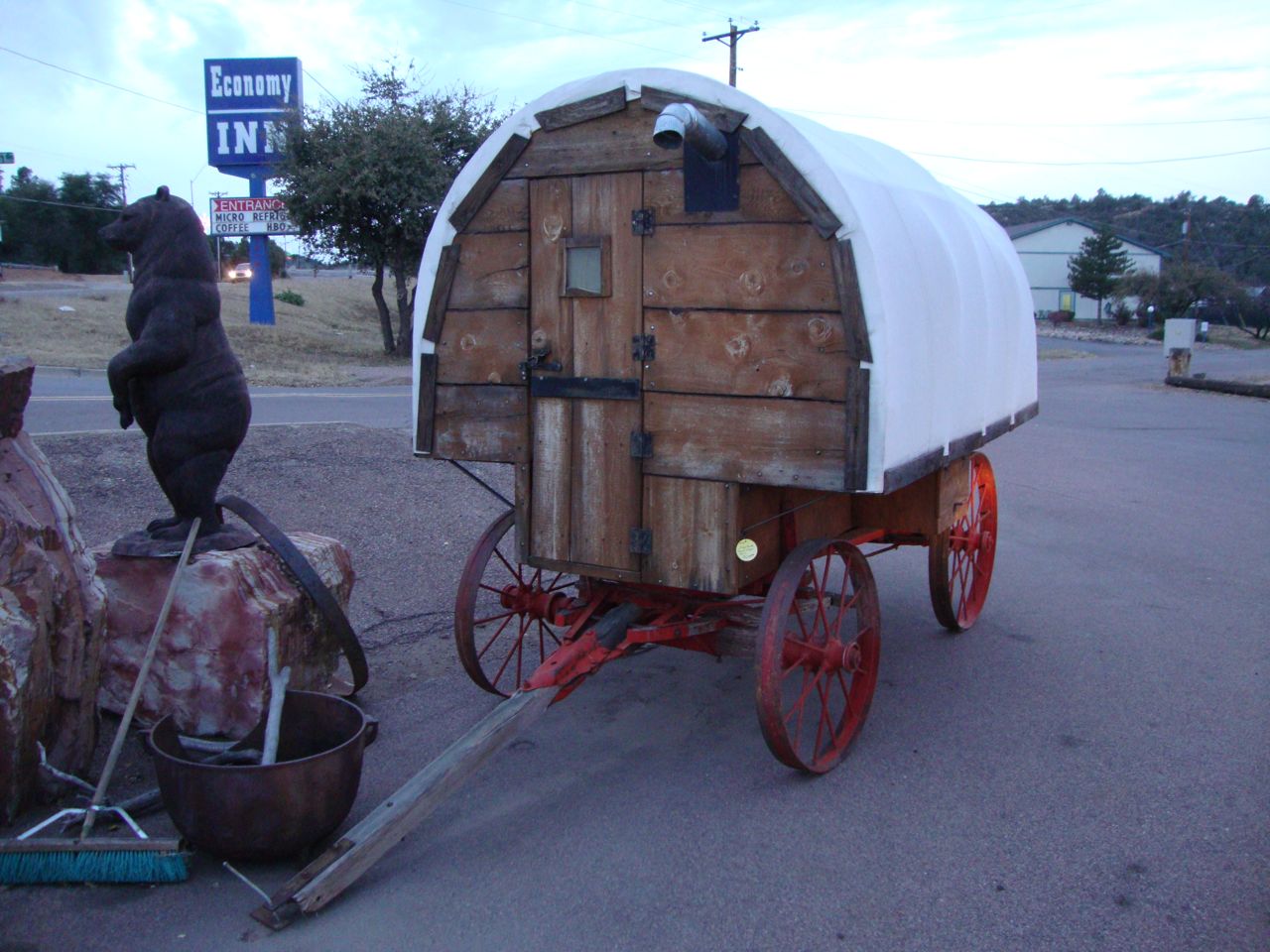 A friend spotted this nice little sheep wagon in Payson, Arizona recently. It’s for sale for $6000 and appears to be in good shape. Canvas cover looks fairly new. It would be a decent cowboy camp if you had horses or burros.