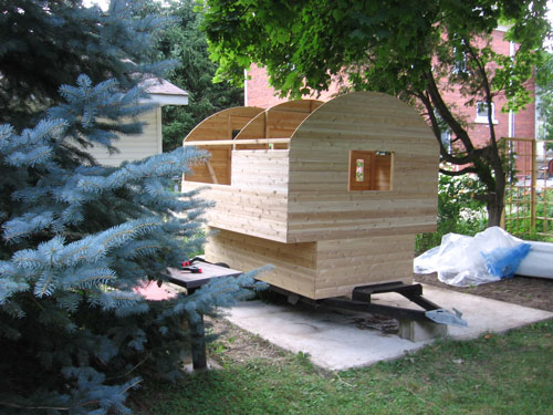 Daphne at Daphne’s Caravans has been busy this summer and appears to have another beautiful wagon nearly ready to sell. Her description is “all cedar, with a roof like a cedar strip canoe. 7′ long, 6′ wide at the ledge, and 6′ high in the centre.” I presume the roof will be epoxied over glass or there will be a covering over the entire thing. If you’ve wanted your very own mini caravan but don’t have the time, tools, or inclination, this might be one for you.