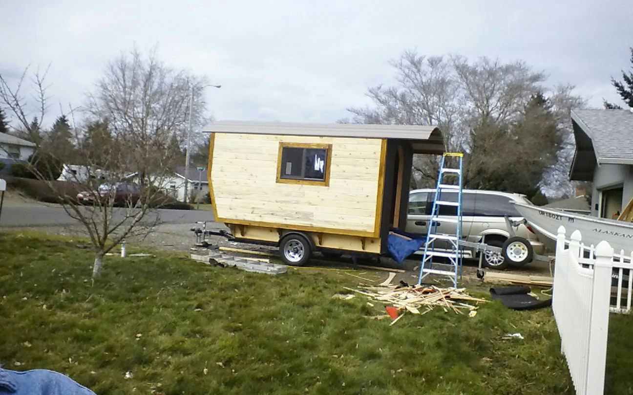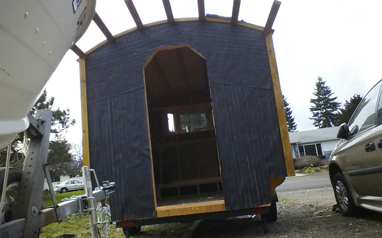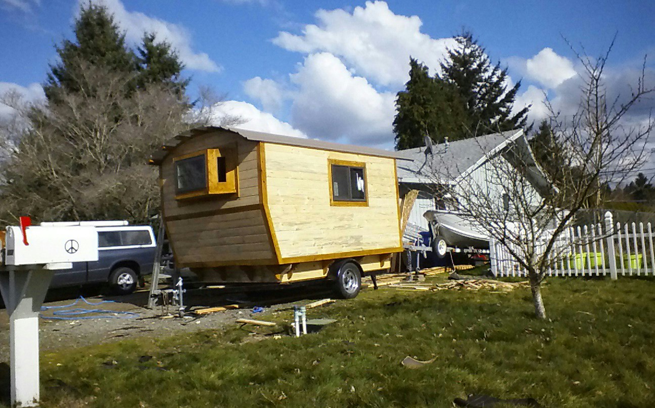 Hal in Oregon sent me some photos of his stick-built vardo.  It is sheathed in house wrap and wood-sided with a metal roof.  Sturdy looking simple design.  So far, he’s spent about two weeks on it and the shell appears to be nearly complete.  This is a link to the album with more photos but I’m not sure it’s public yet.  Please let me know through the comments if this link does NOT work for you.  In the meantime, here are some photos posted by his sister Jodie: