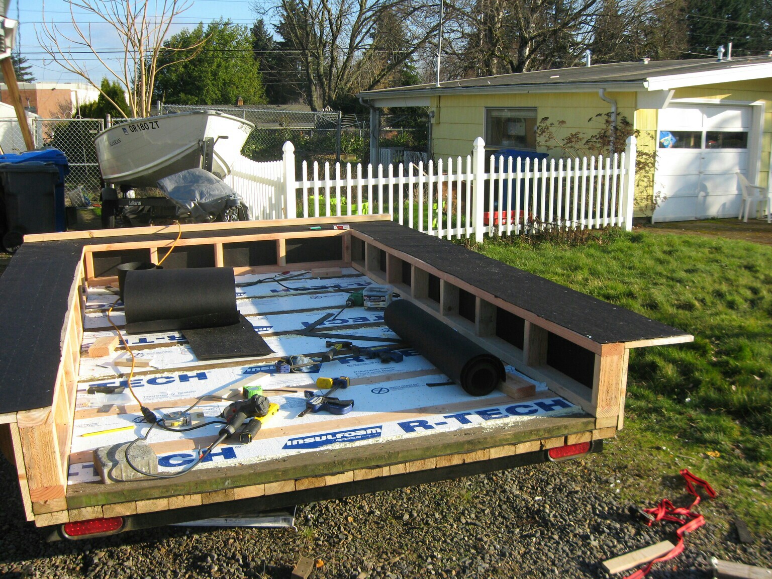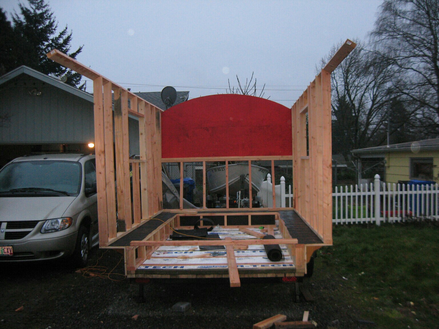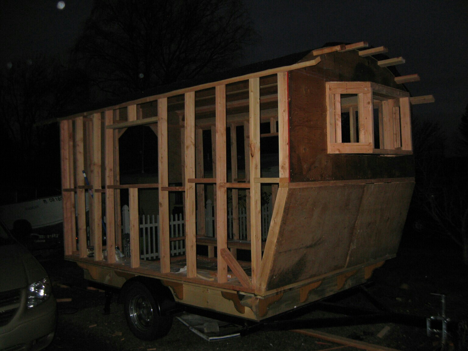 Hal in Oregon sent me some photos of his stick-built vardo.  It is sheathed in house wrap and wood-sided with a metal roof.  Sturdy looking simple design.  So far, he’s spent about two weeks on it and the shell appears to be nearly complete.  This is a link to the album with more photos but I’m not sure it’s public yet.  Please let me know through the comments if this link does NOT work for you.  In the meantime, here are some photos posted by his sister Jodie: