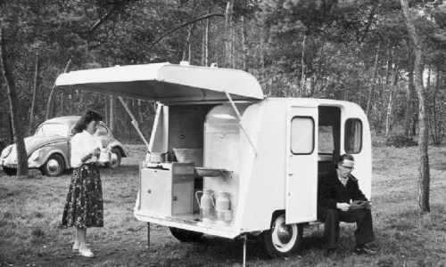 Dutch ‘Kip’-caravan, manufactured in Hoogeveen in Netherland.  A bit more comfortable than the classic teardrop camper, still light enough for any car to be able to pull it.