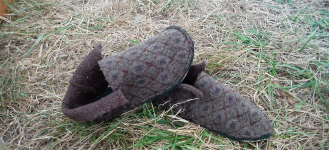 Lovely warm and soft, these shoes (or perhaps slippers) began as an accidentally shrunken wool sweater. These poor, shrunken, often high quality wool sweaters end up in thrift and consignment stores on a regular basis. They also tend to cost next to nothing, so all in all they make perfect material candidates for any felt related project. These shoes are a quick and fairly simple project.