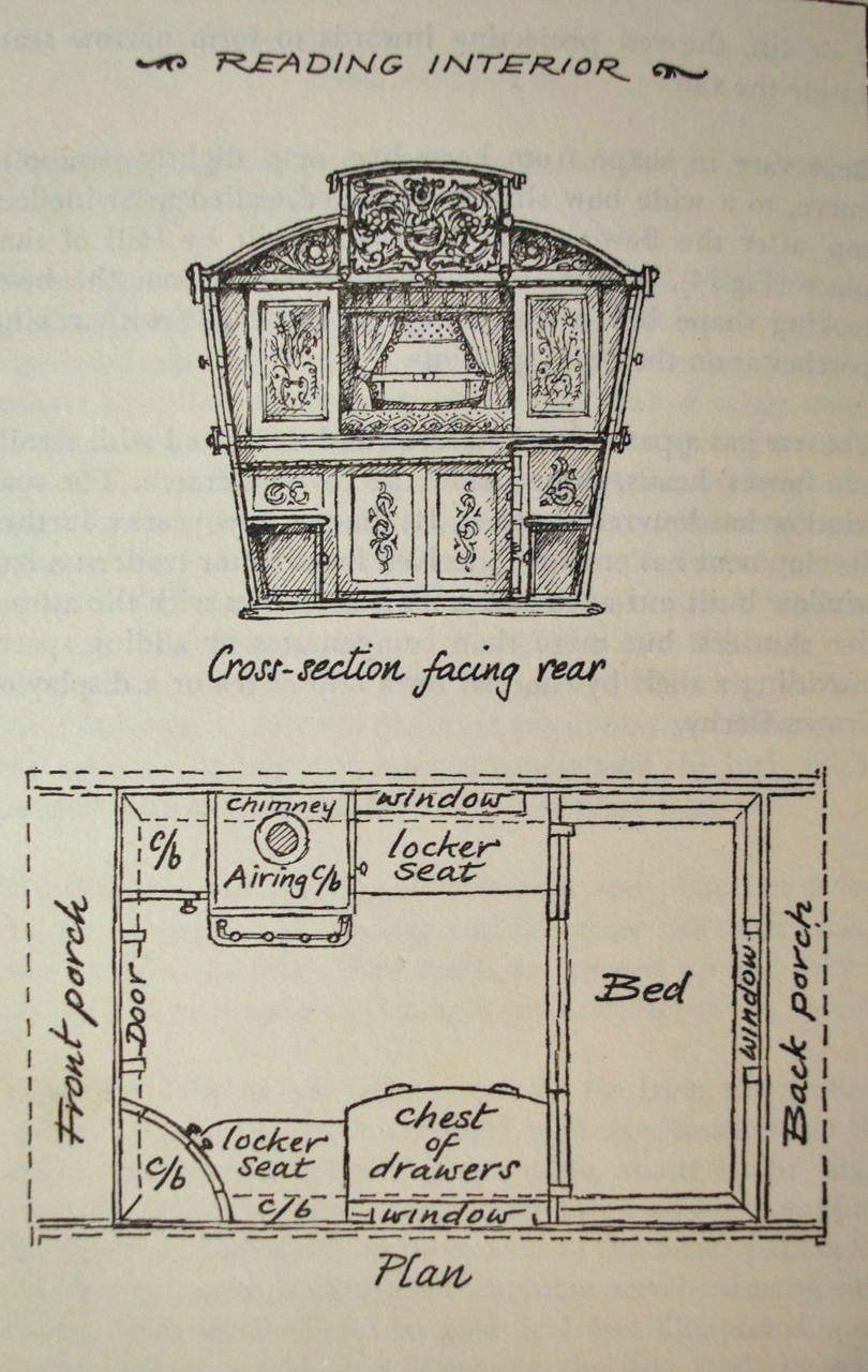 The classic caravan at this period included a full chest of drawers and a fairly large stove, limiting seating to a largish space on the stove side and a small dressing seat next to the dresser. Although we read of dozens of children being born and raise in this design, the real layout seems to be based on the couple. Kids will make due.
