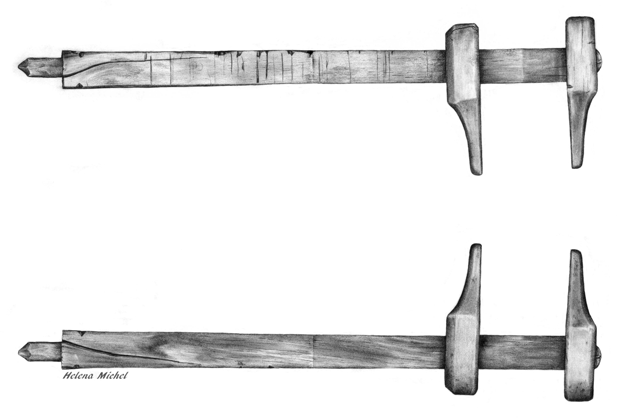 Late medieval wooden artefact: caliper, found in latrine in Gdansk, Poland. Hand drawing by Helena Michel, pencil on paper technique.