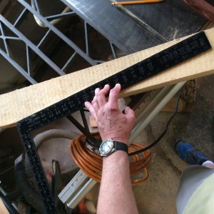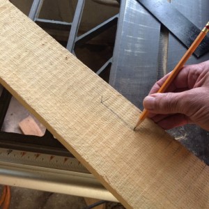 On larger square stock, lay a 24″ framing square or rule diagonally from one edge to the other. “Tick” mark at 7″ and 17″. Hand hold a pencil and mark the lines. (Most people are amazed at how accurately a “hand-held” line can be drawn.)