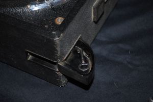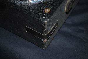 I find about one thing per year in this store that actually piques my interest. This slightly battered black box was pushed back on a bottom shelf mixed in with some old-style slide projectors and video recorders. I thought maybe it was a film camera or possibly a projector. Whatever it was, the case appeared to be from a better era of construction, and judging by the battered handle and nicks in the covering, it was well-loved and was much carried around. The fact it had a key and functioning lock gave me hope.