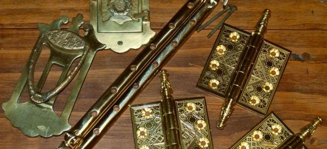 I both got lucky and splurged a bit on new hardware.  The hinges are real beauties and very sturdily built. There is no perceptible play in them whatsoever and they operate very smoothly.  I went with a 19th century Eastlake pattern from House of Antique Hardware in Portland, Oregon.  Great stuff, great service, just too much to choose from.
