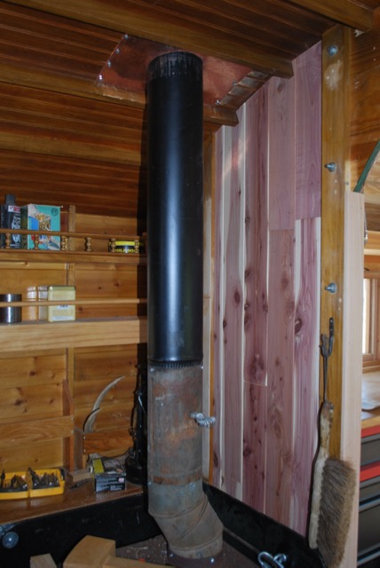 The upper pipe will get a coat of high heat paint while the lower portion will get stove polish along with the stove itself.  In the background, the new juniper paneling is visible.  Otherwise, the place looks like a wreck.  The mallet is handy to solve all measurement problems.