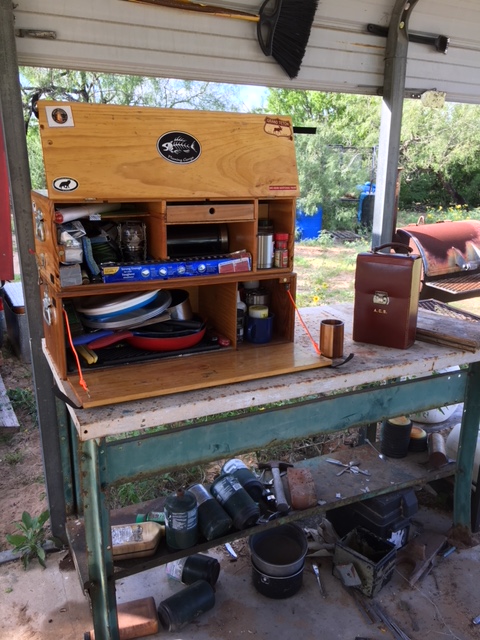 This is how the “chuck box” (cooking box) is stowed when traveling, or when not in use. The small counter top is very handy when brushing your teeth and emptying your pockets at bed time. Underneath, as can be seen, typically is stored a pickers stool, a larger folding camp table, and a folding chair.