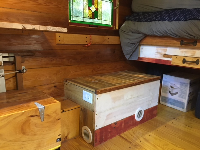 This shot offers a view of the short bench with built-in AC/Heat ducts, one for cooled/heated air (right), and one for return air (left). As well as accommodating air circulation, the bench provides handy storage. Also shown is a 110 volt outlet that provides power to the interior when the Vardo is attached to the generator or some other power supply. There are three interior outlets (the other two are hid pretty well), and three exterior outlets on the camper. There are also 12 volt power plugs inside the camper that are tied to the vardo’s battery. These are great for charging phones and running fans at night. It gets pretty hot along the Texas/Mexican border.