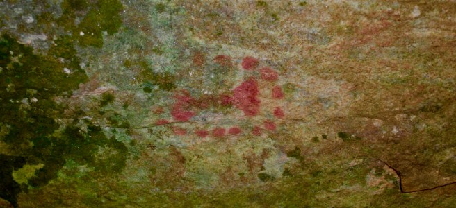 I don’t normally share my professional work on this blog but thought it might be of interest. We were out re-recording a rock shelter yesterday known for some rather mysterious pictographs. Mysterious in that they are vague and probably mostly wiped out due to weathering. Only the protected portions of the shelter contain clear images and only one image is a petroglyph (pecked as opposed to painted).