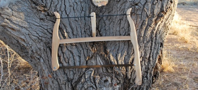 This is the prototype saw I used for teaching a bushcraft class at Echoes in Time in 2014. Unfortunately, a split in the original wood spread last winter and I had to rebuild it. Actually though, that is a beautiful thing when you can make your own tools. I didn’t spend any abstract money for a new one, I didn’t have to trow away some sort of useless and polluting garbage, and I could readily improve the design based on several year’s use and observation. I’ve sold about 20 of these now so the pattern is firmly ingrained in my brain and sinews while tweaking each batch to make them more pleasing to use and efficient to make. without losing the aesthetic of this ancient design.