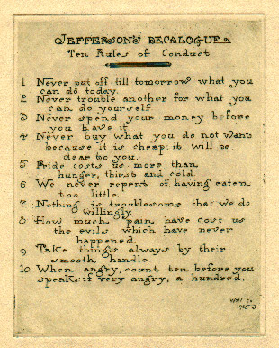 Thomas Jefferson wrote reams of good advice, important political philosophy, the Declaration of Independence, and many other things (which is why we know so much about him).  To some of his younger relations he sent his favorite “Rules of Conduct” to help the people he cared for better and more insightful humans.  These thoughts evolved over time so versions vary slightly depending upon the source.  Here is a facsimile of the ten point “rules” with a slightly different version spelled out below.