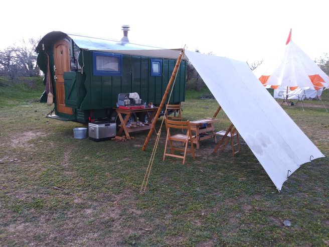It took a couple tries to get a good area to set up in but eventually I risked parking in some low ground. I think it would have been an easy escape had we needed to pull out for rain.The ante-room serves as a staging area for cooking, working on projects, bathing, and other activities.The bed and bedroom are the essence of a vardo. The pared-down essentials of travel. This is the bed extended to full width.The washing up station is my favorite addition. The tank is a recycled Russian samovar and holds a little over a gallon of water. The copper sink provides a place to shave, wash, and brush your teeth.It is all the details and little fixes that happen over time that make the vardo so personal and cozy. I try to focus on the practical and little innovations that make our life easier on the road.In a small space, everything has to have its place. Everything fragile or dangerous also has to have a place to travel to avoid damage.It’s hard to escape an almost nautical feel to the vardo. Many of the same issues have to be overcome as those in a boat. Hence the railings on all the shelves.I owe much to my good friends who have given many of the finer bits and pieces that I use every day we travel.I also enjoy repurposing found objects for real use in the vardo. In this case, some hundred-year-old glass insulators serve as convenient rings to hold a clothesline.The large work counter serves many purposes. My beautiful copper water tank was made by the multi-talented fellow-traveller Mick Robins. The large overhead shelf is very handy for often used items.The slide out bed spends most of the day in this position, giving more floor space as needed. It’s still plenty wide for a single person to sleep on in this configuration.Just as with the 19th century living wagons, I try to use every square inch in a sensible way. Having a wood burning stove in such a small space presents its own set of problems and limitations.This awning arrangement is a new one for me and worked beautifully. The tarp is a fly that normally attaches to my wedge tent but this arrangement served well as a workshop and outdoor cook space for the week.