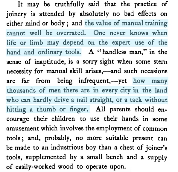 I came across this passage while reading a bit this morning from Amateur Joinery in the Home (1916) by George and Berthold Audsley and thought it would be worthwhile to share.