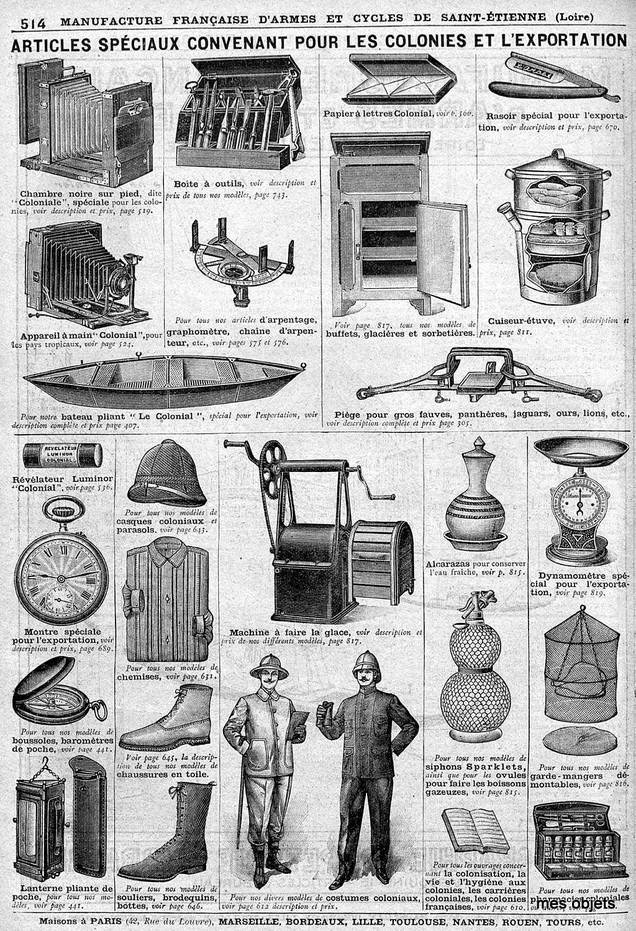 Other European nations partook of the colonization of vulnerable lands with massive resources as well, tying the world together, for good or ill, and shaping the modern world as we know it. It was common for young men to begin their careers by heading to the colonies and other exotic places far from home, so understandably merchants popped up to respond to the needs of this class of colonial gentlemen. Massive catalogues were available to outfit one with everything one would need, and many things one did not, to ease the transition to foreign climes.