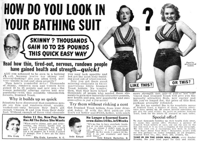 February 1939 magazine advertisement. Ironized Yeast, the quick way to gain weight so you’ll look better in a bathing suit.