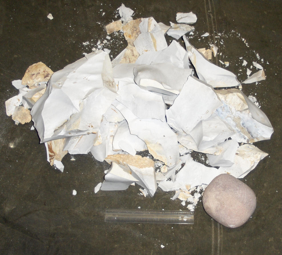 For the front of the poster, I would like to show the entire assemblage of lithic debitage and tools made from a single Burlington chert cobble or similar light colored chert. I was hoping that you and/or some of your friends at the Devil’s hole knap-in would be willing to supply the raw material and muscle to create this assemblage. I will then take the debitage and tools and arrange them with a computer design program into a spiral pattern with a background of obsidian or another dark colored lithic source.”Since this original contact, a few things were changed. Pete Bostrom was asked to do the layout and photography, for one.As with any project, unexpected hurdles arise and it’s up to the participants to modify their strategies and adapt to those hurdles.First: After Larry blanked out the nodule, it became apparent that he was producing much more debitage and many more tools than he had anticipated. That’s when he decided to stick with only a Late Archaic Assemblage. The wide variability in point sizes, shapes, and chert, along with the occurrence of many different types of chert tools, during the Late Archaic, seemed to gravitate toward that time period. Also, the tools could have been heat-treated if the stone had not worked as well as it did.Second: It also became apparent that this project presented a unique opportunity to try to understand the amount of material needed to produce certain point types. So, after the initial photograph of the raw nodule was taken by Pete Bostrom, and at the suggestion of Dr. Baumann, Larry saved all debitage, from all the point-making attempts, separately. This provided the opportunity to not only see what type of point could be made from a single spall but also, the other tools could be isolated to their specific spalls.Third:The sheer amount of material produced during the project, presented Pete Bostrom with problems too. How could he possibly display all that material and make it interesting to the general public? After all, that’s what the poster’s supposed to do, get the general public interested in archaeology.So:1) It was decided to keep all debitage, from each spall, separate.2) Keep separate notes and times on each spall using Larry’s pre-printed forms. Like this: 3) Photograph the resulting point types with their debitage.4) Use the debitage from each point to make additional tools.5) Photograph each point type, its additional tools, and debitage, together.6) Screen all debitage, from each spall, through window screen, to determine how much chert grit would have been available to do core-drilling for other projects, such as, drilling bannerstones.7) Weigh all materials. (Dr. Bauman weighed all the material, in Larry’s absence, due to surgery).8) Present Pete Bostrom with all the material so he could lay out and take the photographs for the poster.9) Present the photos to the printer so the posters could be made.Initial reduction from core to useful materials.