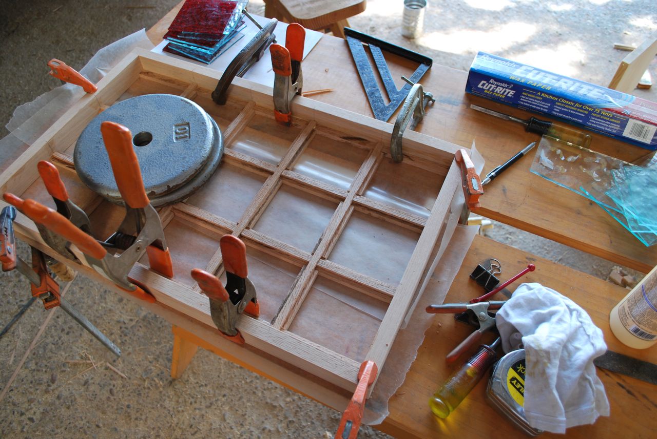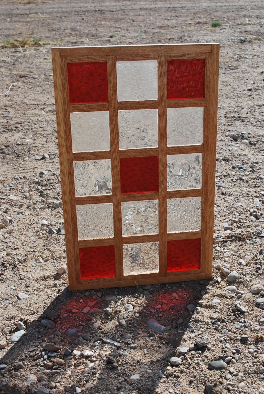 Fitted with three types of glass; wavy clear, hammered clear, and red with a lot of break-up. The widow will be fitted into a frame (pre-hung) so that it can be removed entirely for repair or replacement of the door. More to come soon.