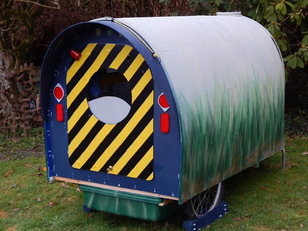 The body is 2 meters long by 1.04 meters wide (79 by 41 inches). The frame is constructed from 20 mm square steel tubing welded together and the 5 bows are made from 8 mm tubing covered with garden hose. The whole thing runs on 28″ wheels.