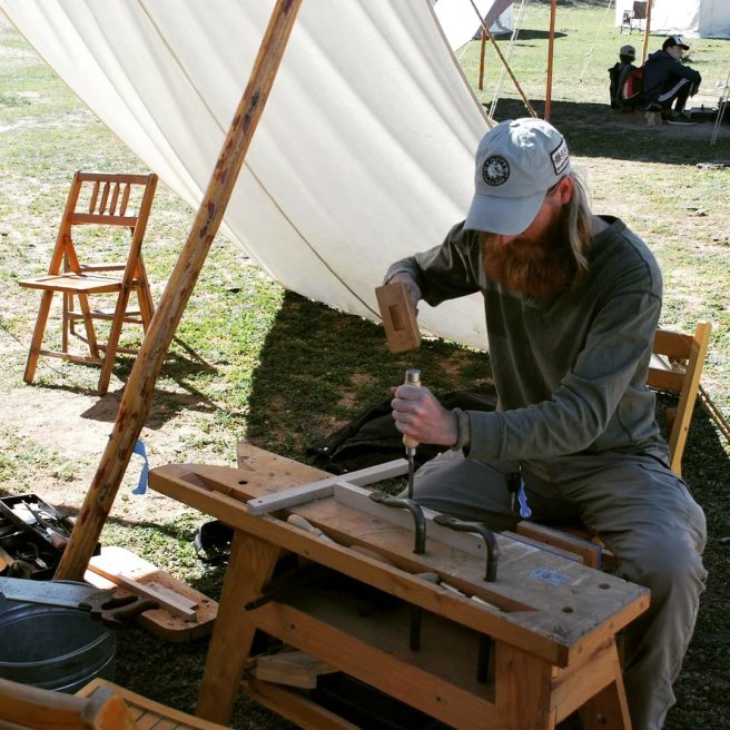 Here is another action shot fixing the tiller on someone’s bow at Winter Count several years ago. I wouldn’t normally have a giant, heavy stave leaning on the horse but the photographer insisted on it for some reason. I was just hoping it wouldn’t bean me with a very sharp draw-knife in my hand (hence my switch to the rasp for the photo).