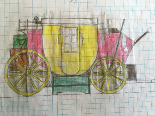 “The canvas-covered sheep wagon was roughly about seven feet wide by eight feet long. On the front end a door opened out of the middle and you stepped down onto the wagon tongue and thence to the ground. From the inside looking out, the stove was on the left of the door. On the right was a small wash stand with several wooden drawers for storage of linens, towels and socks. A bucket of water and washbasin were on the oil cloth covered top and a small mirror hung above the basin for shaving. Soap, toothbrush, razor and essentials rested on top of the stand when in location or were stowed in a drawer when moving.”