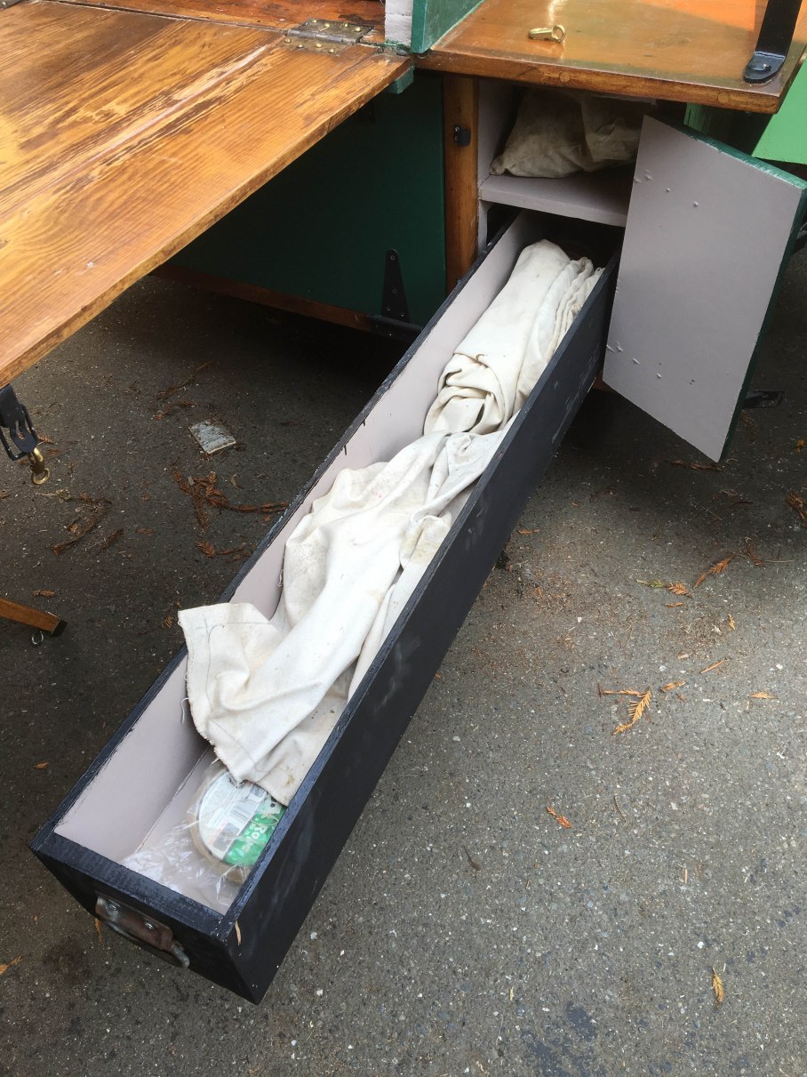 A couple elbows and a short run of pipe completed the plumbing “system” and installation was a breeze. A small shelf to hold a couple Dr. Bronner’s bottles and a towel bar will be added soon to complete the set-up. The storage area to the left was sized to hold the beautiful new copper cistern during travel. The cistern will live outside in the kitchen area when encamped.