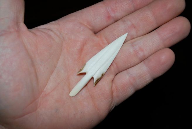The pithy cancelous (spongy) tissue inside some antler makes them less than perfect for large points. The denser tissue on the outside can be cut off and works well for flat projects, like buttons or, in the above case, an arrow point.