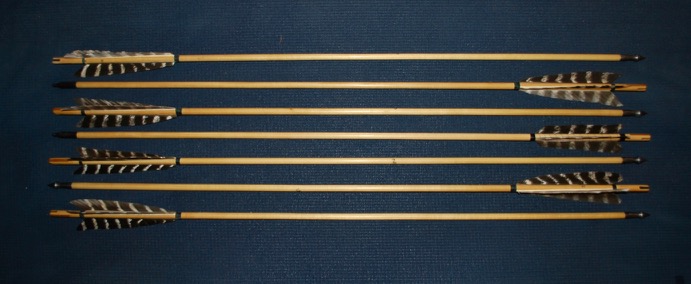 The poplar arrows above were made from aged, straight-grained wood that was split along the grain then turned in a dowel cutter. The nocks are reinforced with Bois d’arc (Osage orange) wood for added strength. The heads are conical bodkins, fletchings are prime turkey wing secured with glue and silk binding.