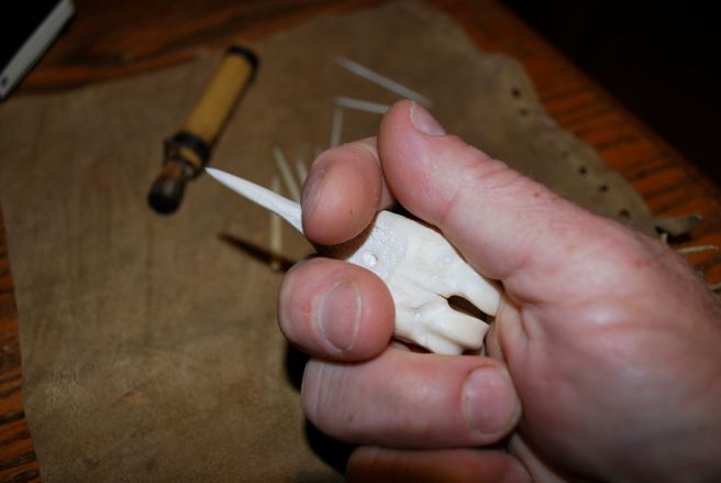 I do quite a bit of sewing and I feel it is an essential skill for nearly everyone. My sewing includes new buckskin trousers, cotton shirts, shoes, a few leather bags, backpacks, and repairs to clothes to name just a few projects. All this has caused me to think about sewing without manufactured goods. Over a few evenings I decided to make a better primitive sewing kit. Although I can’t say that bone could fully replace the smallest steel needles in my day-to-day sewing basket, I have been able to make some very small ones indeed from some deer legs I have lying around.