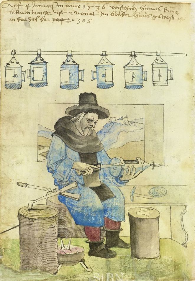 The lantern maker has more great tools. He is set up in front of the window for light. His work surfaces are stumps but his bench is a fancy trestle type, not the typical tenon leg affair one normally sees from this period of history. In this image, the smith is in the act of soldering the base onto the lantern. This is the oldest image I have found, so far, of a soldering iron in use. The little three-legged pot on the floor is a brazier, holding coals to heat the iron and he has a pretty nifty stake tool on the bench. I think it’s a shears but please correct me if I’m wrong on that one.