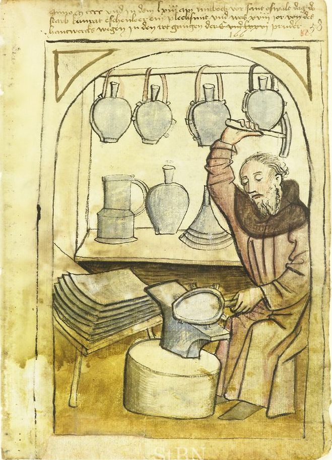 Here we see a smith creating a flask. I doubt he would be whacking it from that height but old images of carpenters and smiths use this convention to show the movement. Behind him are some of his wares including a pitcher, something shaped like a bottle, and a pile of funnels. A stack of prepared metal sheets sits on a table next to him.