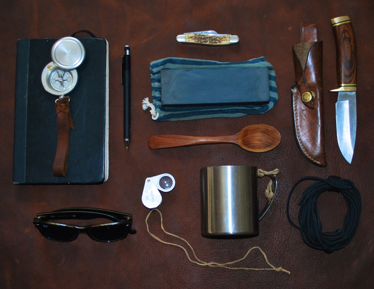 This is most of the contents from the above bag; mostly things I don’t like to be without. Clockwise (more-or-less) from the upper left: Brunton pocket compass with signal mirror, Moleskine notebook, pencil, folding knife, whetstone with bag, belt knife, wooden spoon, 550 paracord, insulated mug, hand lens, sunglasses.