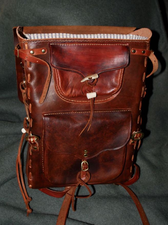 I already had a “look” in mind and already decided on the construction technique. Should it be a six panel body for easier layout or single panel around the body for a more seamless build? Should it be sewn, laced, or riveted and what pockets does it need? Will it be “turned” (seams hidden inside) or will the closings be visible? Finally, where to begin construction? We can’t close the body until the external sewing is done so pockets and straps were a good place to start.