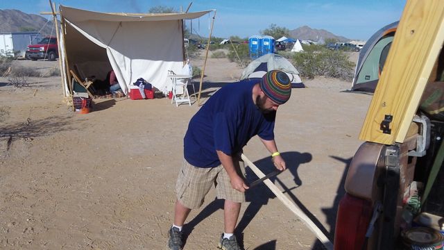 This awning arrangement is a new one for me and worked beautifully. The tarp is a fly that normally attaches to my wedge tent but this arrangement served well as a workshop and outdoor cook space for the week.