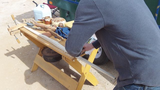 It is a little more difficult to teach such a hands-on skill to groups, as opposed to individuals, but the class seemed to go very well. The point was not to just make a bow but to learn enough of the concepts that everyone in the class should be able to go home and make more without much guidance. A key to the success is using good staves to begin with. There is enough to learn without added problems of twists and knots in the raw material.