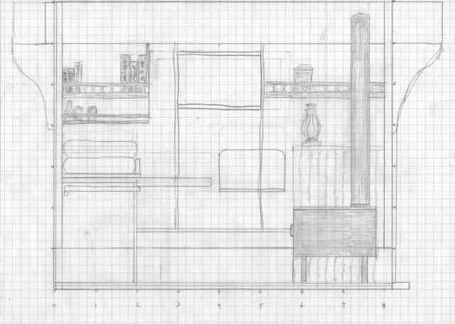 The essential layout was solidified 125 years ago. There are only a limited number of combinations that meet the human needs on this sort of scale. I tried every combination on paper and in models but always returned to the standard layout of bed across the rear, hide-away table, bench seats, shelving, and of course, the wood burning stove. Despite the limitations, there is some variety within these parameters and that is where the fun begins.