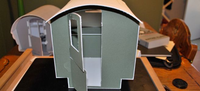 I made several 1:12 mock-ups to help me understand the space relative to a cardboard human figure. Can I stand fully? Can I kneel on the bed? Is there enough space for two people to comfortably sit? In the end, this was the model I drew from.